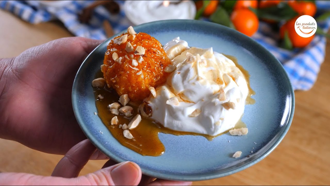 Des clémentines doucement rôties qui libèrent leurs arômes caramélisés, accompagnées d’un yaourt fouetté aérien pour un dessert frais et lumineux.